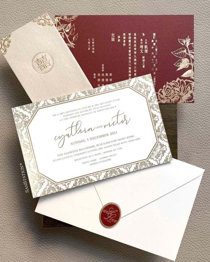 派禮餅給親戚是傳統嫁囍習俗。嫁女餅是過大禮其中禮品之一,唐餅必須派雙數。現在大部分新人都選擇以嫁女餅卡或西餅卡代替,方便派送且不易過期。注意新娘不可以吃自己的嫁女餅,象徵把福氣吃光,並不吉利。 - 結婚喜帖/結婚邀請卡